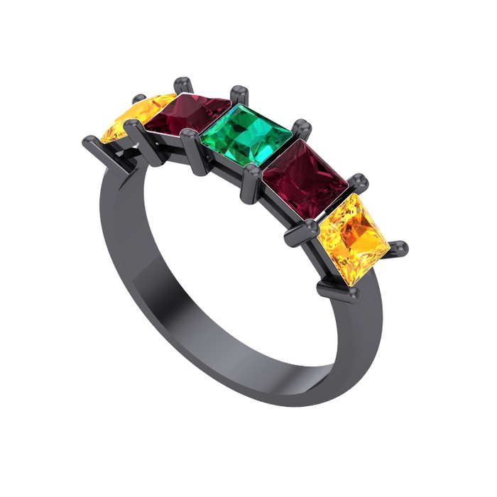 Yeşil kuvars, kök yakut ve sitrin 925 ayar siyah rodyum kaplama gümüş yüzük