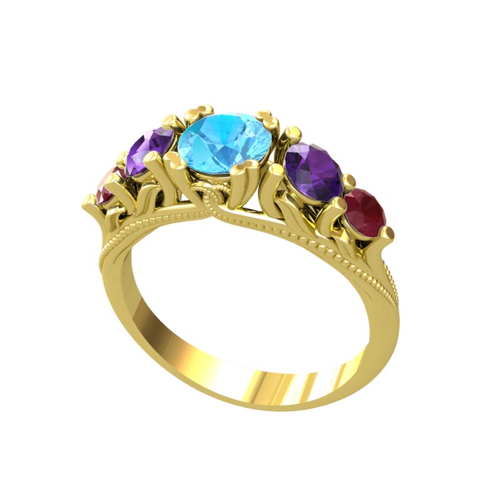 Akuamarin, ametist ve kök yakut 8 ayar altın yüzük