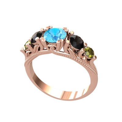Akuamarin, siyah zirkon ve peridot 18 ayar rose altın yüzük