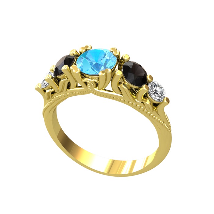 Akuamarin, siyah zirkon ve swarovski 18 ayar altın yüzük