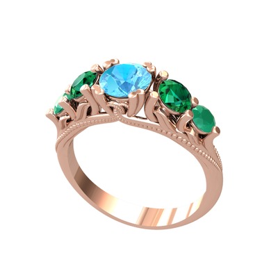Akuamarin, yeşil kuvars ve kök zümrüt 14 ayar rose altın yüzük