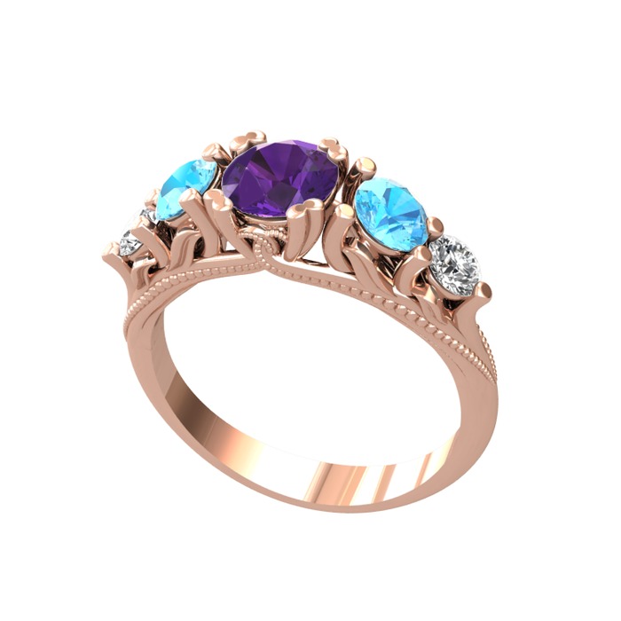 Ametist, akuamarin ve pırlanta 925 ayar rose altın kaplama gümüş yüzük (0.36 karat)