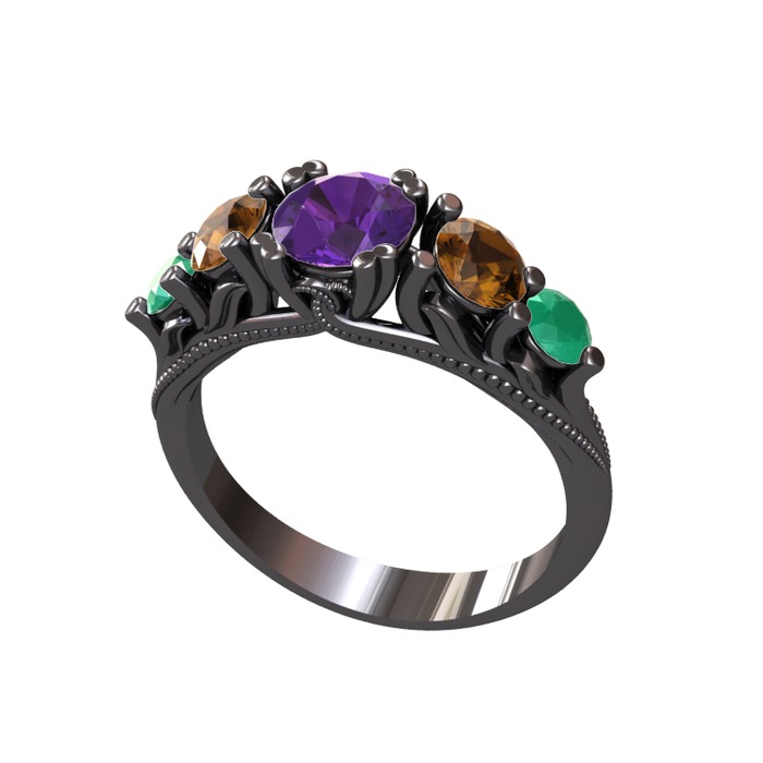 Ametist, dumanlı kuvars ve kök zümrüt 925 ayar siyah rodyum kaplama gümüş yüzük
