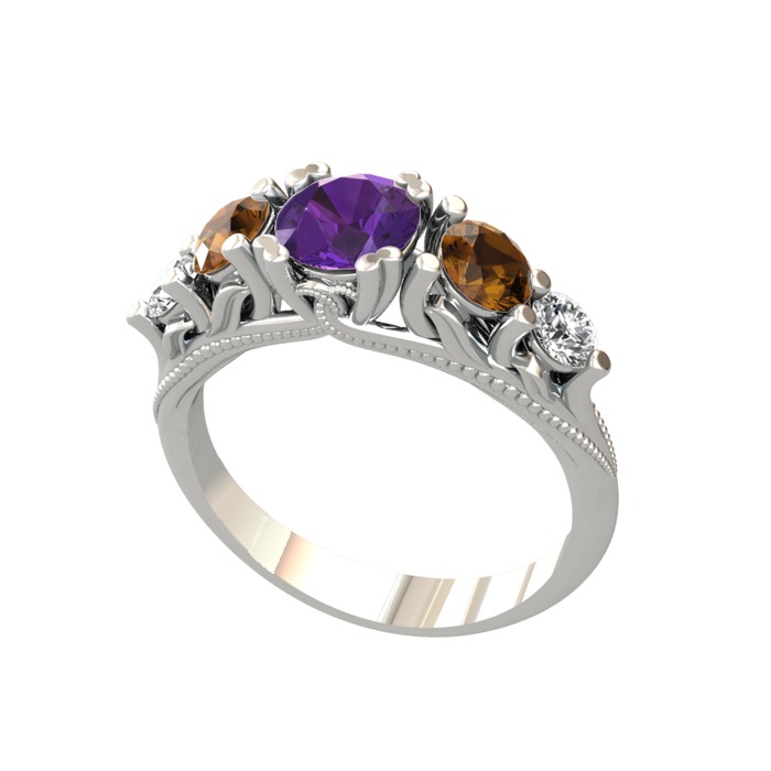 Ametist, dumanlı kuvars ve pırlanta 8 ayar beyaz altın yüzük (0.36 karat)