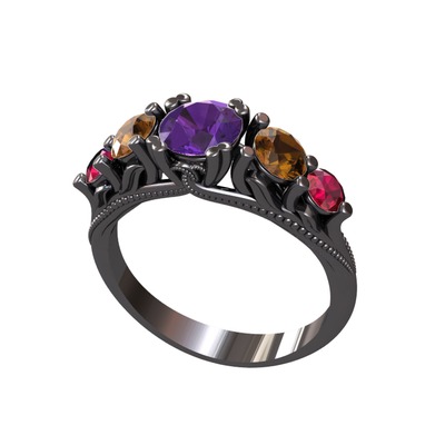 Ametist, dumanlı kuvars ve rodolit garnet 925 ayar siyah rodyum kaplama gümüş yüzük