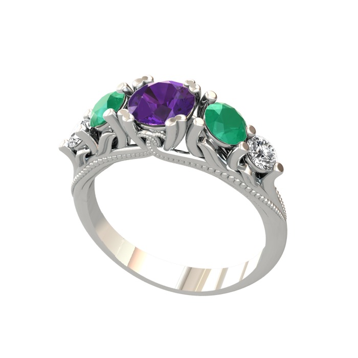 Ametist, kök zümrüt ve pırlanta 8 ayar beyaz altın yüzük (0.36 karat)