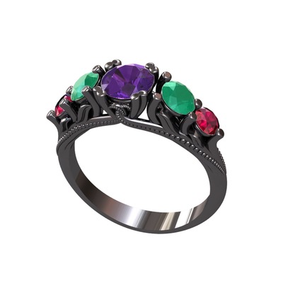 Ametist, kök zümrüt ve rodolit garnet 925 ayar siyah rodyum kaplama gümüş yüzük