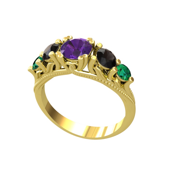 Ametist, siyah zirkon ve yeşil kuvars 18 ayar altın yüzük