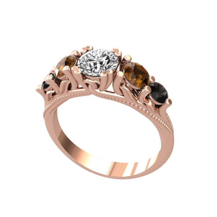 Beyaz zirkon, dumanlı kuvars ve siyah zirkon 925 ayar rose altın kaplama gümüş yüzük