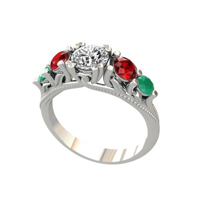 Beyaz zirkon, garnet ve kök zümrüt 8 ayar beyaz altın yüzük