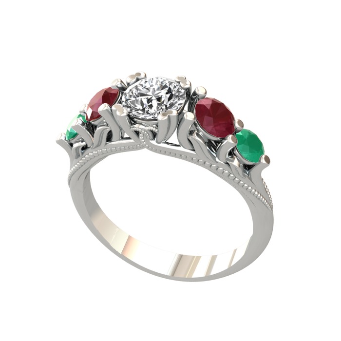 Beyaz zirkon, kök yakut ve kök zümrüt 18 ayar beyaz altın yüzük