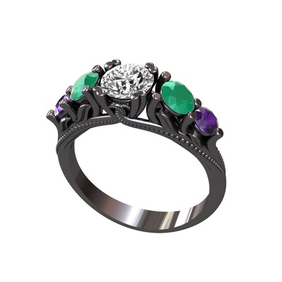 Beyaz zirkon, kök zümrüt ve ametist 925 ayar siyah rodyum kaplama gümüş yüzük