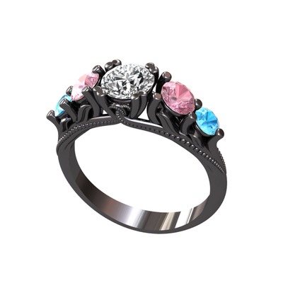 Beyaz zirkon, pembe kuvars ve akuamarin 925 ayar siyah rodyum kaplama gümüş yüzük