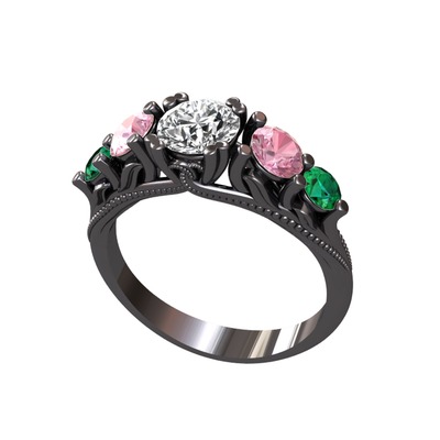 Beyaz zirkon, pembe kuvars ve yeşil kuvars 925 ayar siyah rodyum kaplama gümüş yüzük