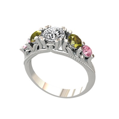 Beyaz zirkon, peridot ve pembe kuvars 14 ayar beyaz altın yüzük