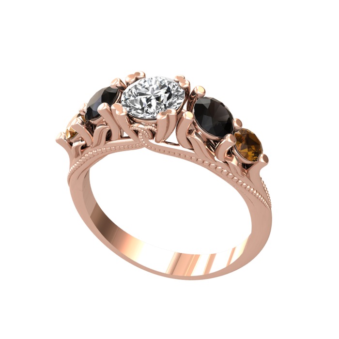 Beyaz zirkon, siyah zirkon ve dumanlı kuvars 18 ayar rose altın yüzük