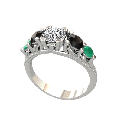 Beyaz zirkon, siyah zirkon ve kök zümrüt 925 ayar gümüş yüzük