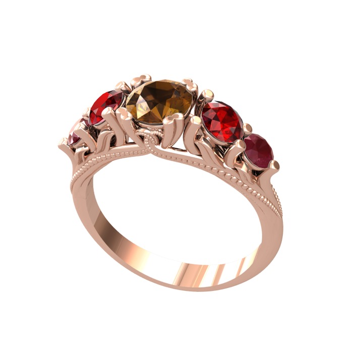 Dumanlı kuvars, garnet ve kök yakut 14 ayar rose altın yüzük