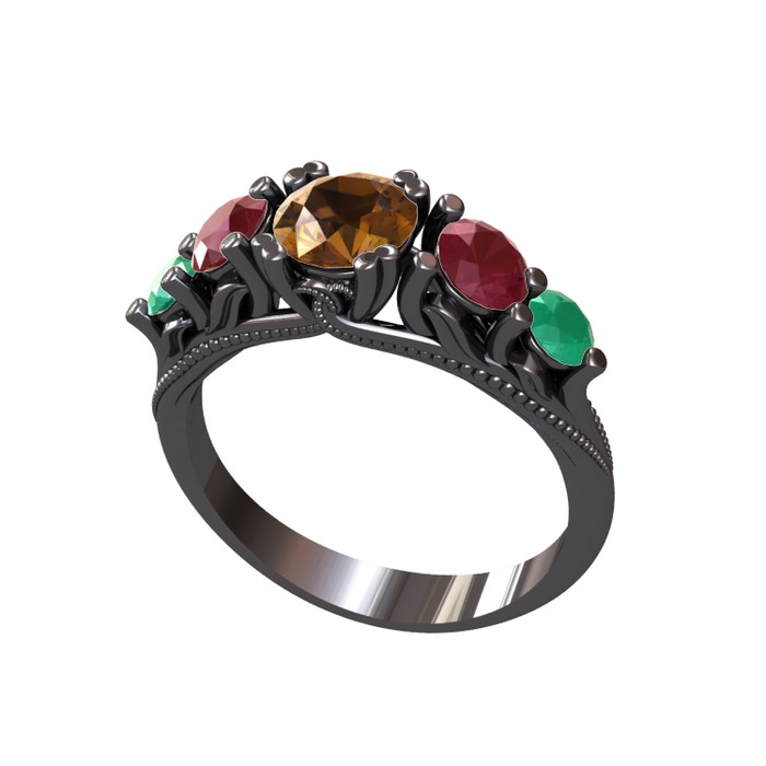Dumanlı kuvars, kök yakut ve kök zümrüt 925 ayar siyah rodyum kaplama gümüş yüzük