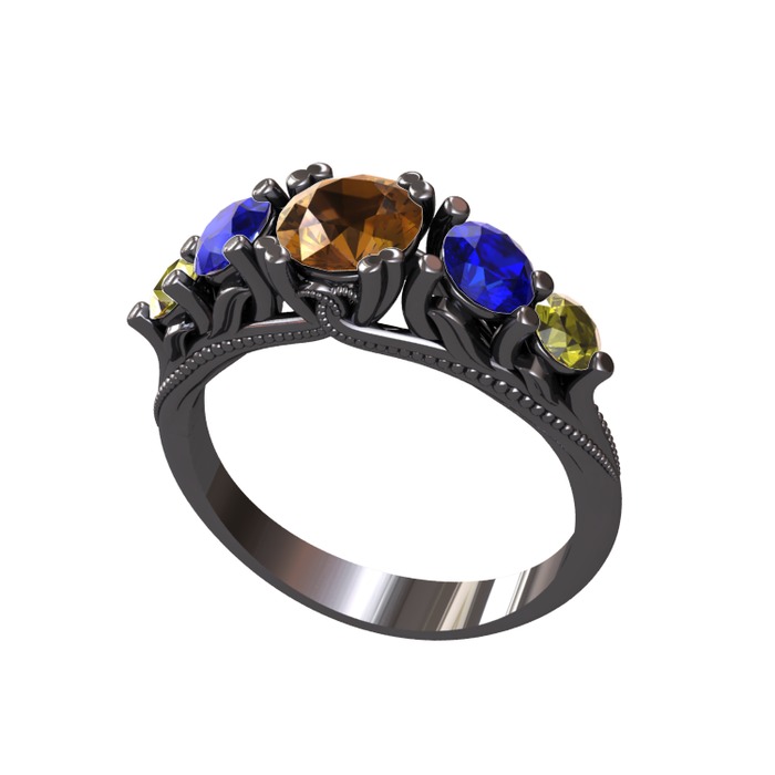 Dumanlı kuvars, lab safir ve peridot 925 ayar siyah rodyum kaplama gümüş yüzük