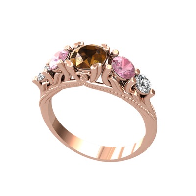 Dumanlı kuvars, pembe kuvars ve pırlanta 925 ayar rose altın kaplama gümüş yüzük (0.36 karat)