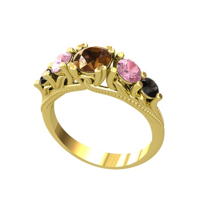 Dumanlı kuvars, pembe kuvars ve siyah zirkon 8 ayar altın yüzük