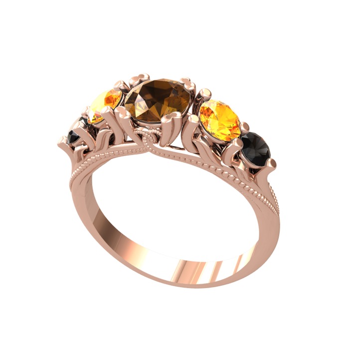 Dumanlı kuvars, sitrin ve siyah zirkon 925 ayar rose altın kaplama gümüş yüzük