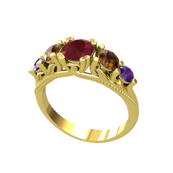 Kök yakut, dumanlı kuvars ve ametist 8 ayar altın yüzük