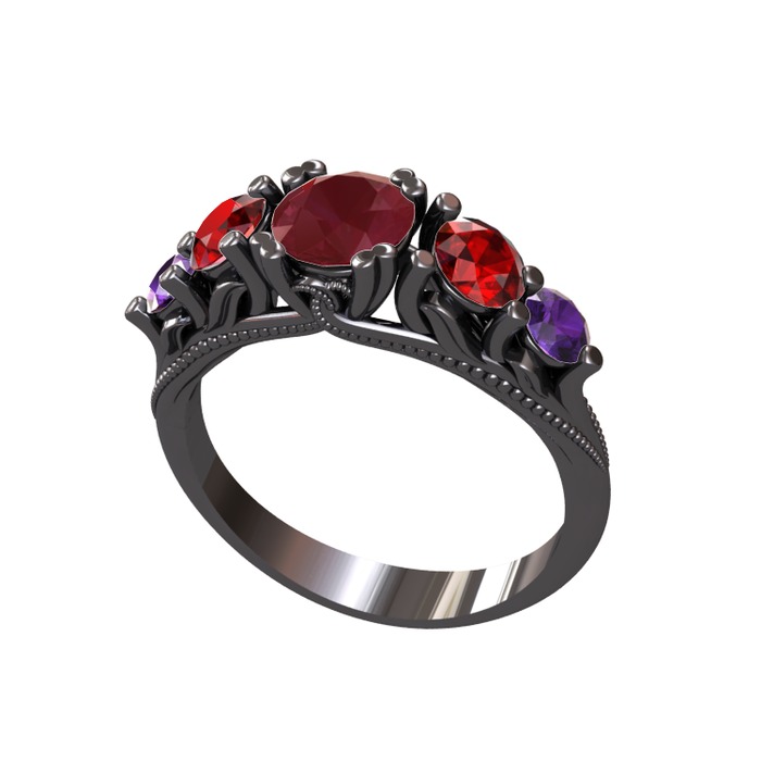 Kök yakut, garnet ve ametist 925 ayar siyah rodyum kaplama gümüş yüzük