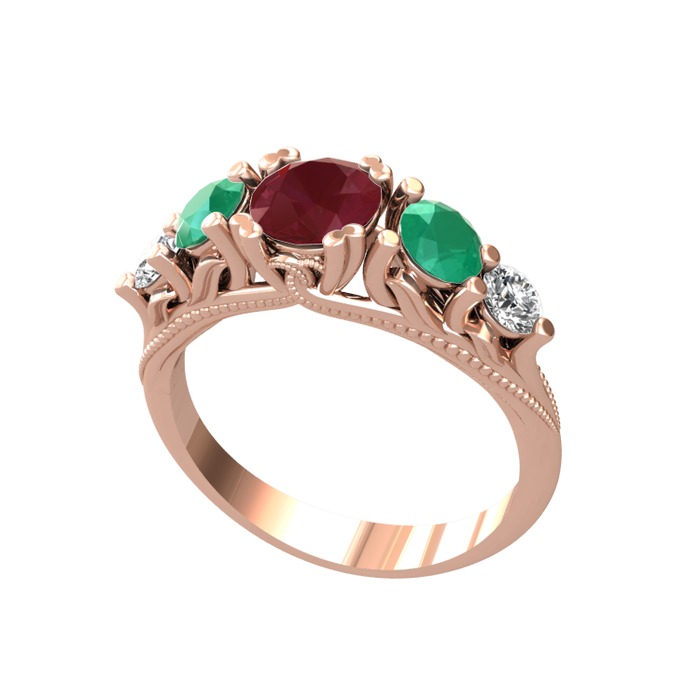 Kök yakut, kök zümrüt ve beyaz zirkon 14 ayar rose altın yüzük