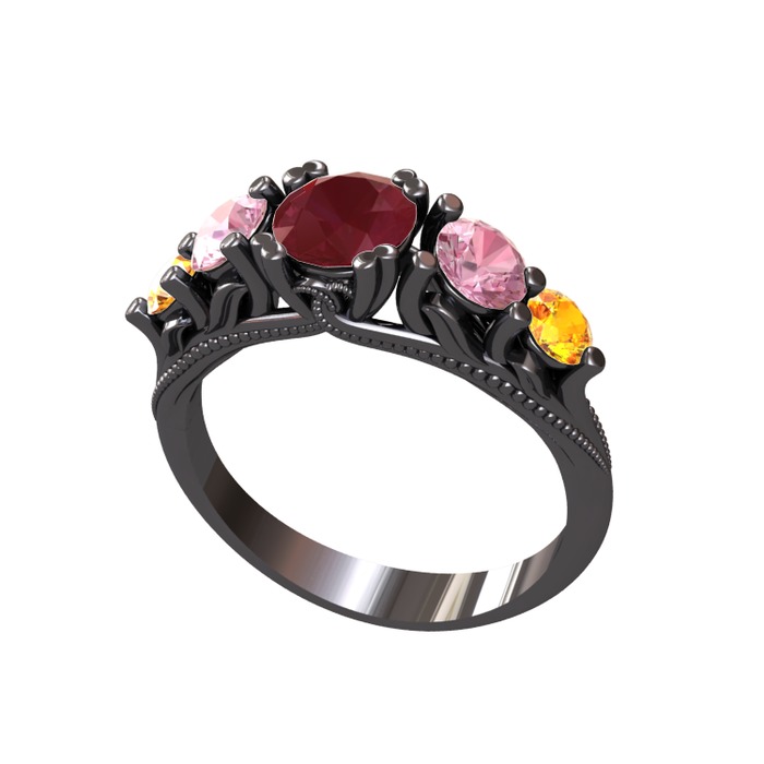 Kök yakut, pembe kuvars ve sitrin 925 ayar siyah rodyum kaplama gümüş yüzük