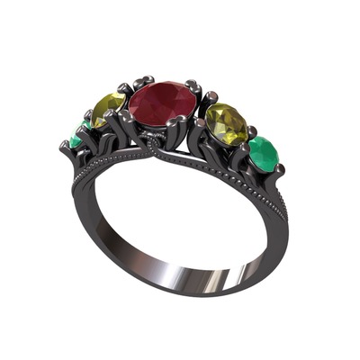 Kök yakut, peridot ve kök zümrüt 925 ayar siyah rodyum kaplama gümüş yüzük