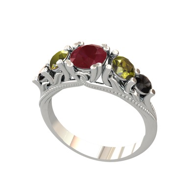 Kök yakut, peridot ve siyah zirkon 14 ayar beyaz altın yüzük