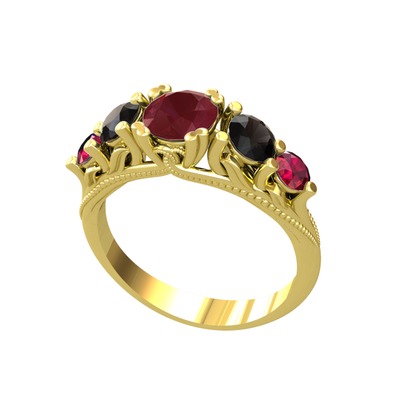 Kök yakut, siyah zirkon ve rodolit garnet 14 ayar altın yüzük