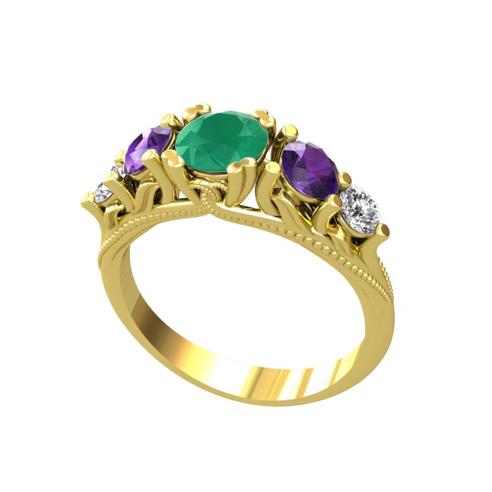 Kök zümrüt, ametist ve swarovski 8 ayar altın yüzük