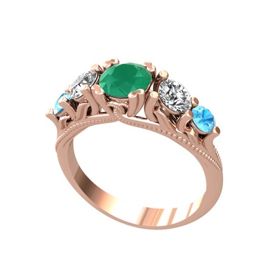 Kök zümrüt, beyaz zirkon ve akuamarin 8 ayar rose altın yüzük