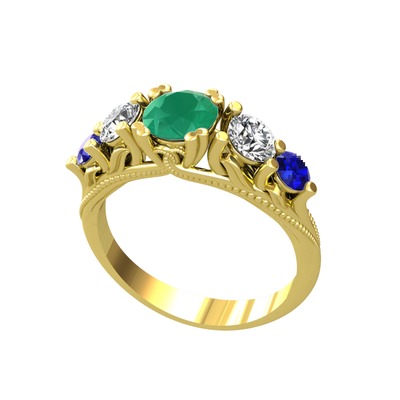 Kök zümrüt, beyaz zirkon ve lab safir 14 ayar altın yüzük