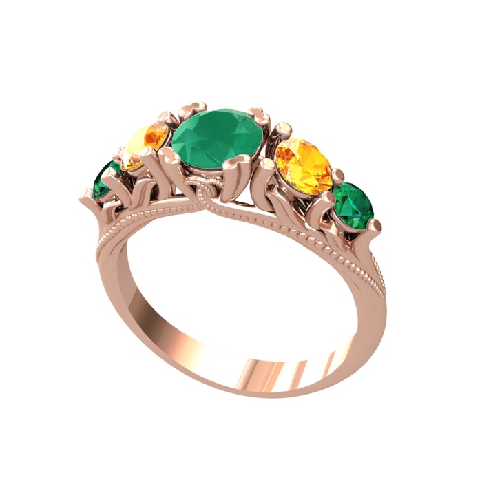 Kök zümrüt, sitrin ve yeşil kuvars 8 ayar rose altın yüzük
