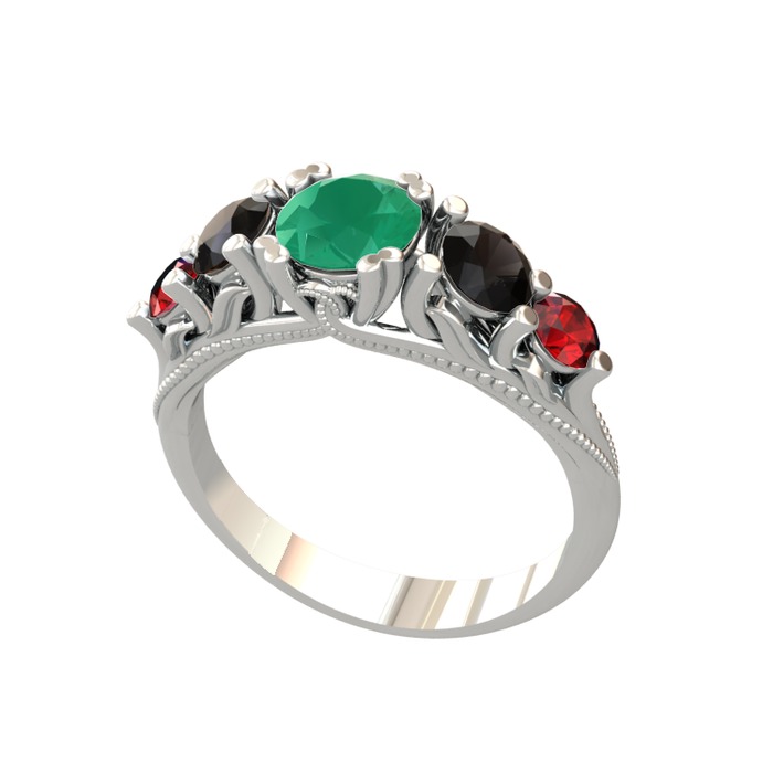 Kök zümrüt, siyah zirkon ve garnet 14 ayar beyaz altın yüzük