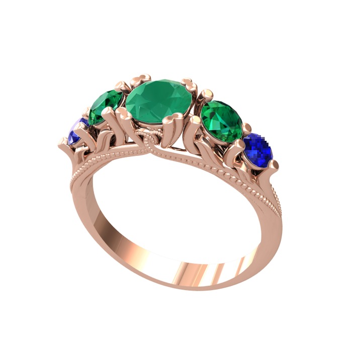 Kök zümrüt, yeşil kuvars ve lab safir 14 ayar rose altın yüzük