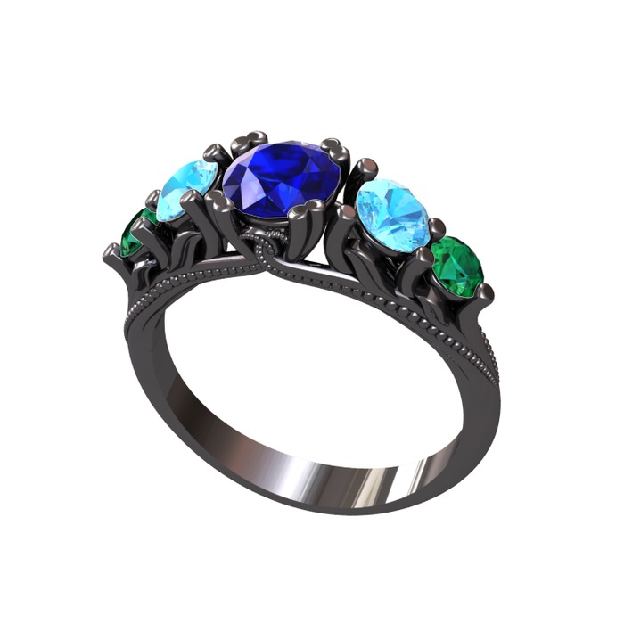Lab safir, akuamarin ve yeşil kuvars 925 ayar siyah rodyum kaplama gümüş yüzük