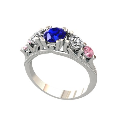 Lab safir, beyaz zirkon ve pembe kuvars 14 ayar beyaz altın yüzük