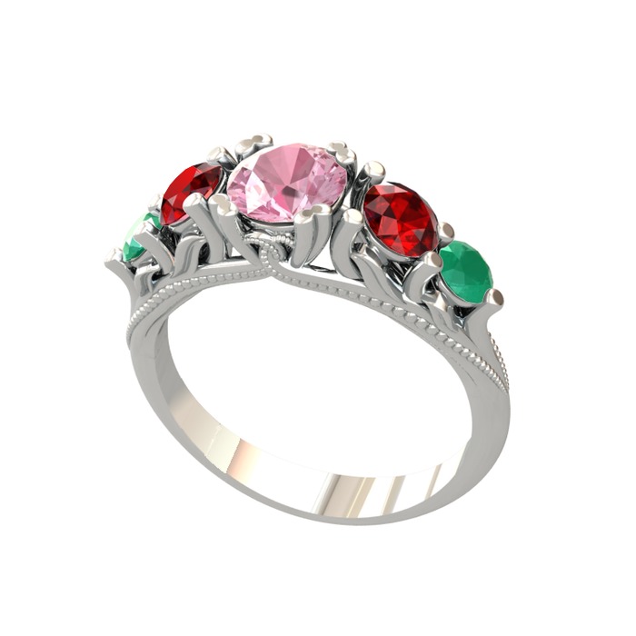 Pembe kuvars, garnet ve kök zümrüt 18 ayar beyaz altın yüzük