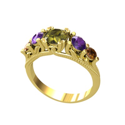 Peridot, ametist ve dumanlı kuvars 8 ayar altın yüzük