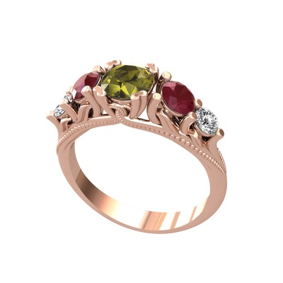 Peridot, kök yakut ve beyaz zirkon 14 ayar rose altın yüzük