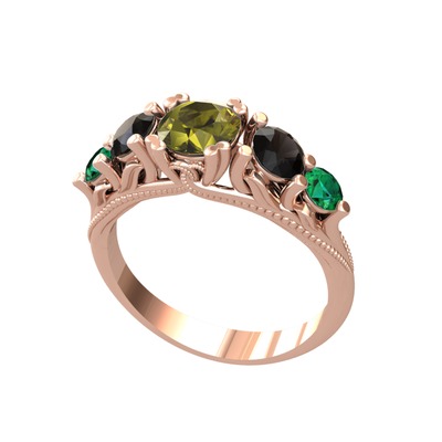 Peridot, siyah zirkon ve yeşil kuvars 925 ayar rose altın kaplama gümüş yüzük