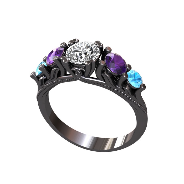 Pırlanta, ametist ve akuamarin 925 ayar siyah rodyum kaplama gümüş yüzük (0.92 karat)