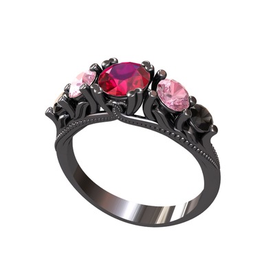 Rodolit garnet, pembe kuvars ve siyah zirkon 925 ayar siyah rodyum kaplama gümüş yüzük