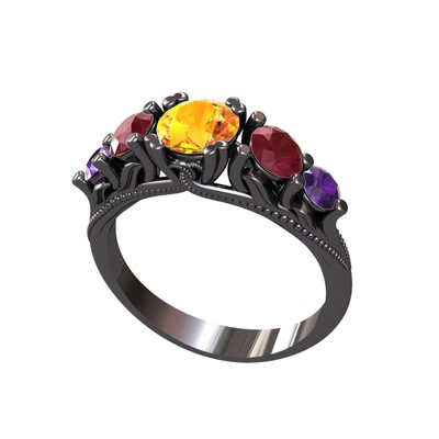 Sitrin, kök yakut ve ametist 925 ayar siyah rodyum kaplama gümüş yüzük