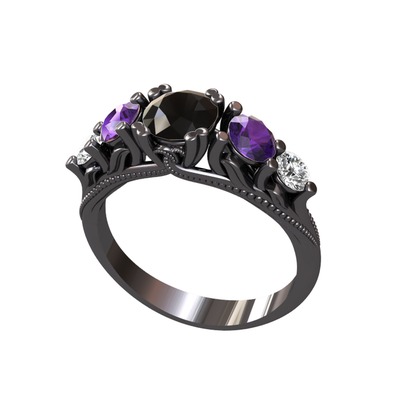 Siyah zirkon, ametist ve pırlanta 925 ayar siyah rodyum kaplama gümüş yüzük (0.36 karat)